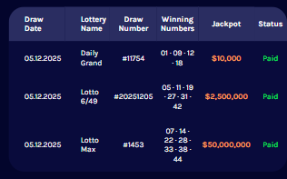 | 05.12.2025 | Daily Grand | #11754 | 01 · 09 · 12 · 18 | $10,000 | Paid |